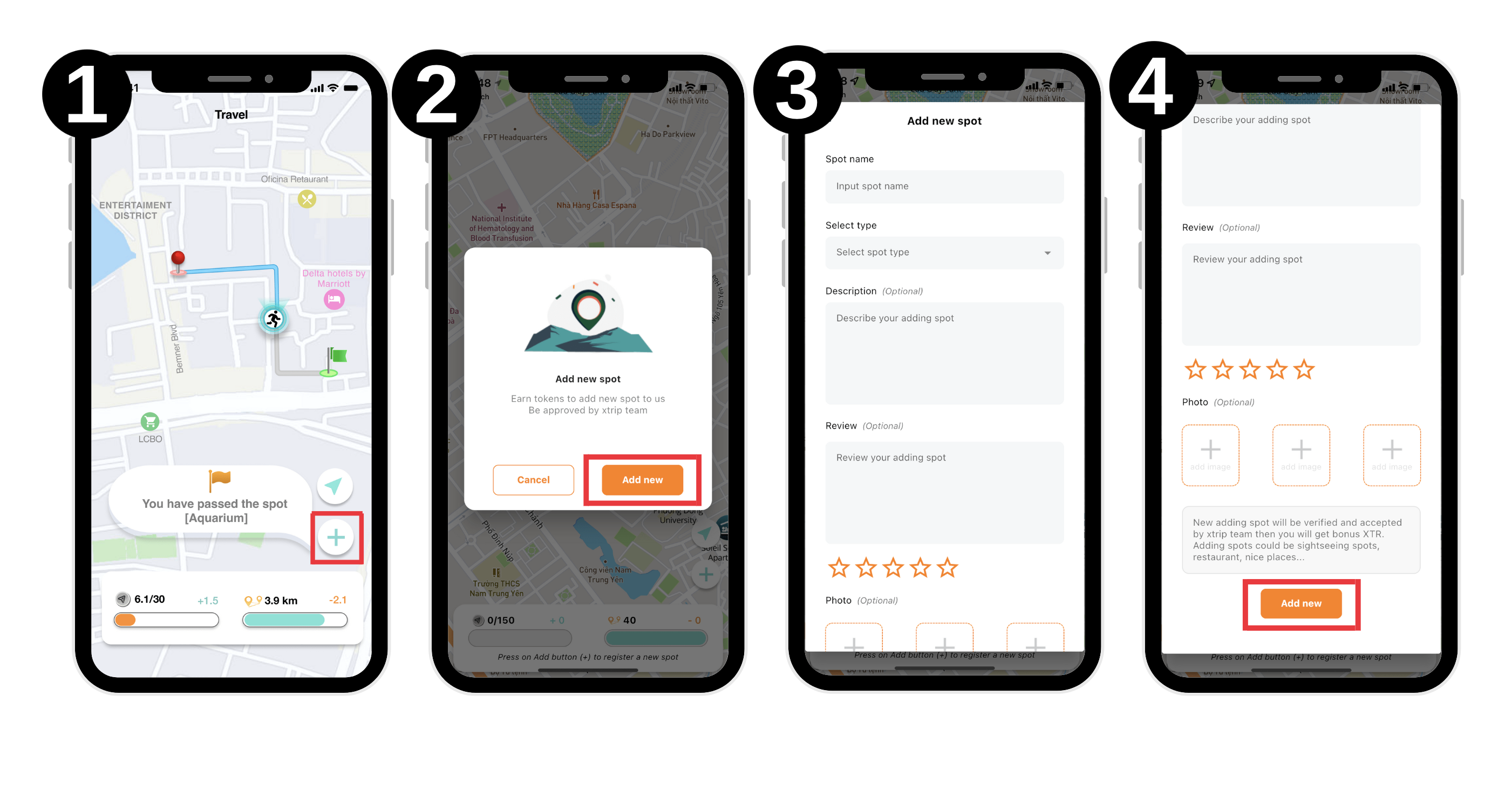 Once users visit spots, they can earn XTR or GXT with the following actions: